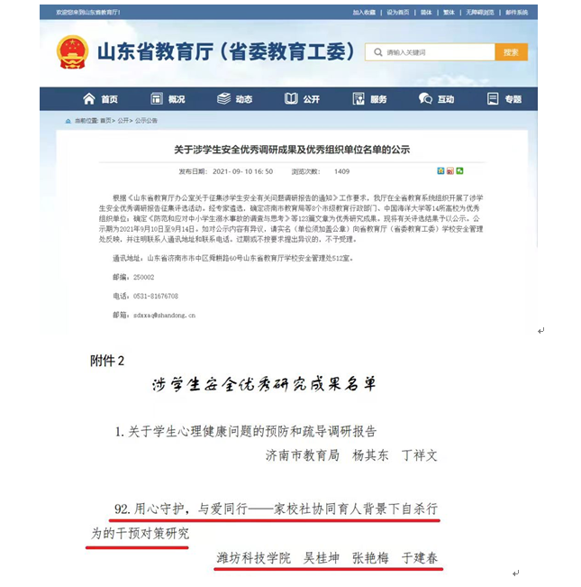 近日,山东省教育厅在全省教育系统组织开展了涉学生安全优秀调研报告征集评选活动。经严格评选,确定《防范和应对中小学生溺水事故的调查与思考》等123篇文章为优秀研究成果。其中,我校吴桂坤、张艳梅、于建春老师的项目“用心守护,与爱同行——家校社协同育人背景下自杀行为的干预对策研究”荣获优秀研究成果奖项!