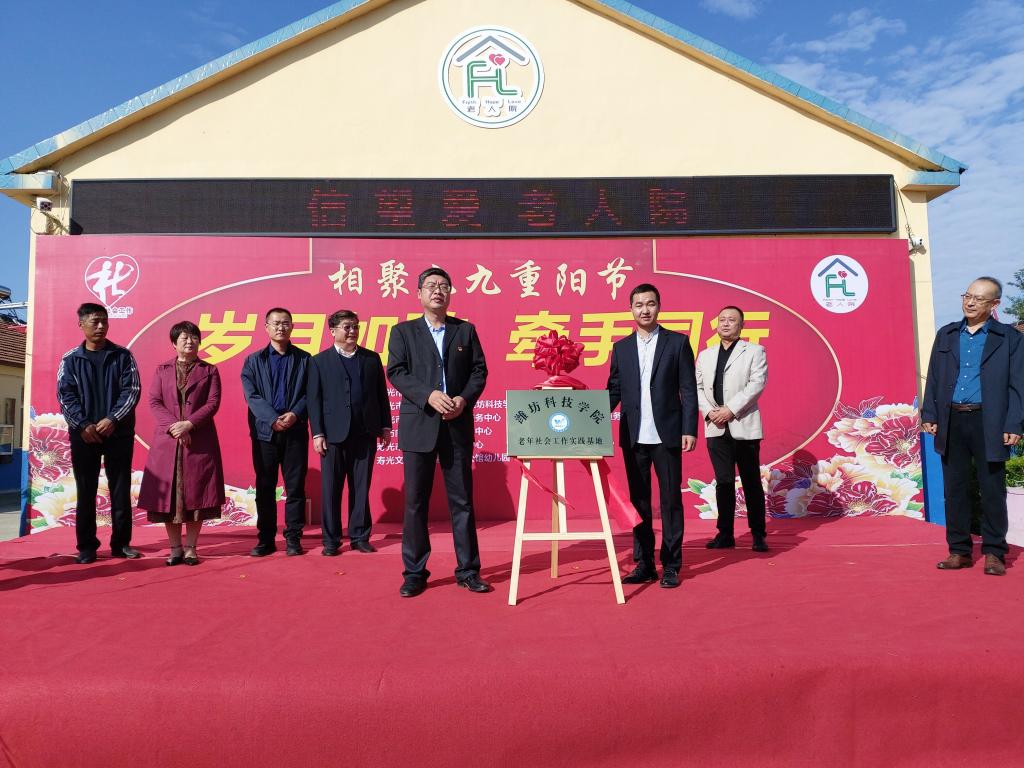 10月13日上午,由寿光市民政局举办,我校和寿光市社工协会承办的相聚重阳节“岁月如歌、牵手同行”老年人社会工作服务活动在信望爱老人院举行。经济管理学院书记刘波、社会工作专业老师宋吉东及部分学生代表等到寿光市信望爱老人院慰问老人,并为潍坊科技学院老年社会工作实习基地揭牌。我校学生为老人们带来了丰富多彩的文艺演出,送去来自学校的关怀。