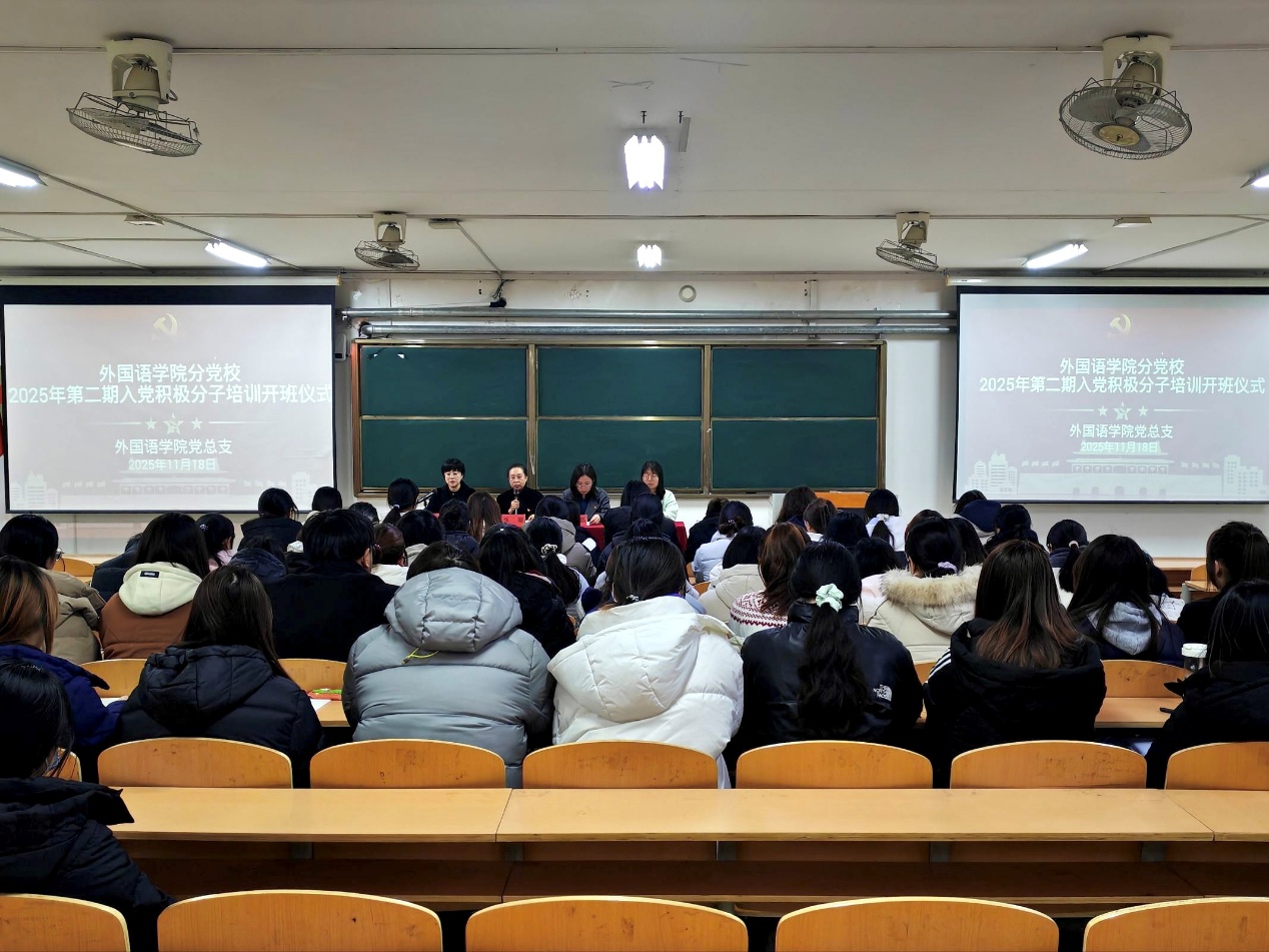 为强化入党积极分子教育培养工作,11月18日,外国语学院2025年第二期入党积极分子培训班开班仪式在113教室举行。学院党总支书记张丽、副书记郝磊、团总支书记祖晓莹、党建组织员孙凯丽及全体参训学员参加仪式,祖晓莹主持仪式。