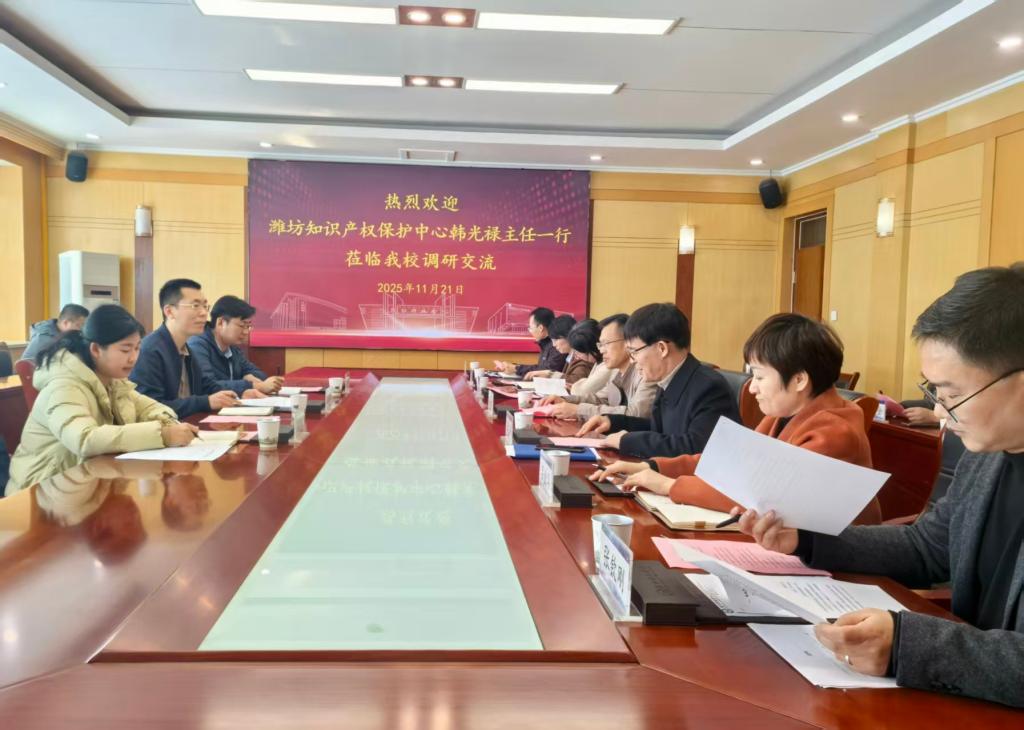 为深化知识产权协同保护,赋能高校科技创新,11月24日,潍坊知识产权保护中心(以下简称“保护中心”)确权质控科科长韩光禄一行来校调研交流。寿光市市场监管局党组成员、二级主办董建波,学校党委委员、副校长张友祥及相关部门负责人陪同座谈。