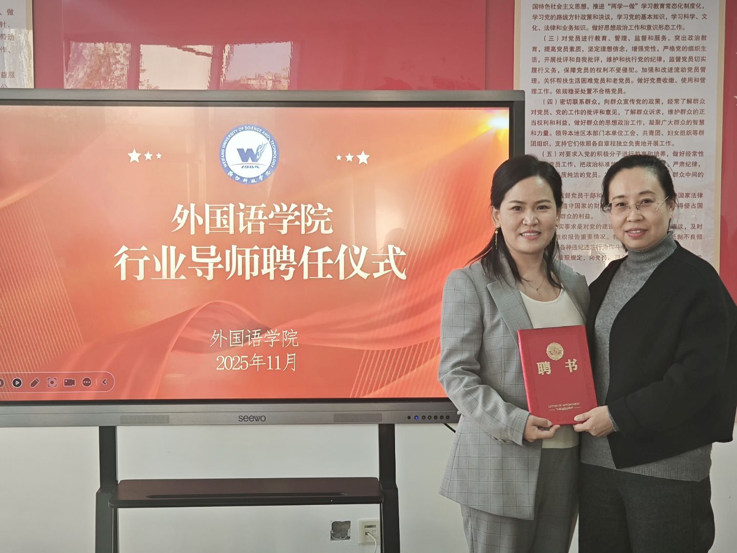 互动环节气氛热烈,师生就外语专业外贸发展路径、课程与实务匹配度等问题深入交流。郝磊总结时表示,赵再再的分享兼具实操性与启发性,为学生职业规划提供了鲜活指引。会上,张丽为赵再再颁发行业导师聘书,她表示,聘任优秀校友担任行业导师,是学院深化产教融合、强化实践育人的一项重要举措。她强调,这份聘书承载着荣誉,更寄托着责任与期望,期待赵再再校友以其卓越的行业洞察与实践经验反哺母校,为外语学子的职业规划与成长路径精准赋能。