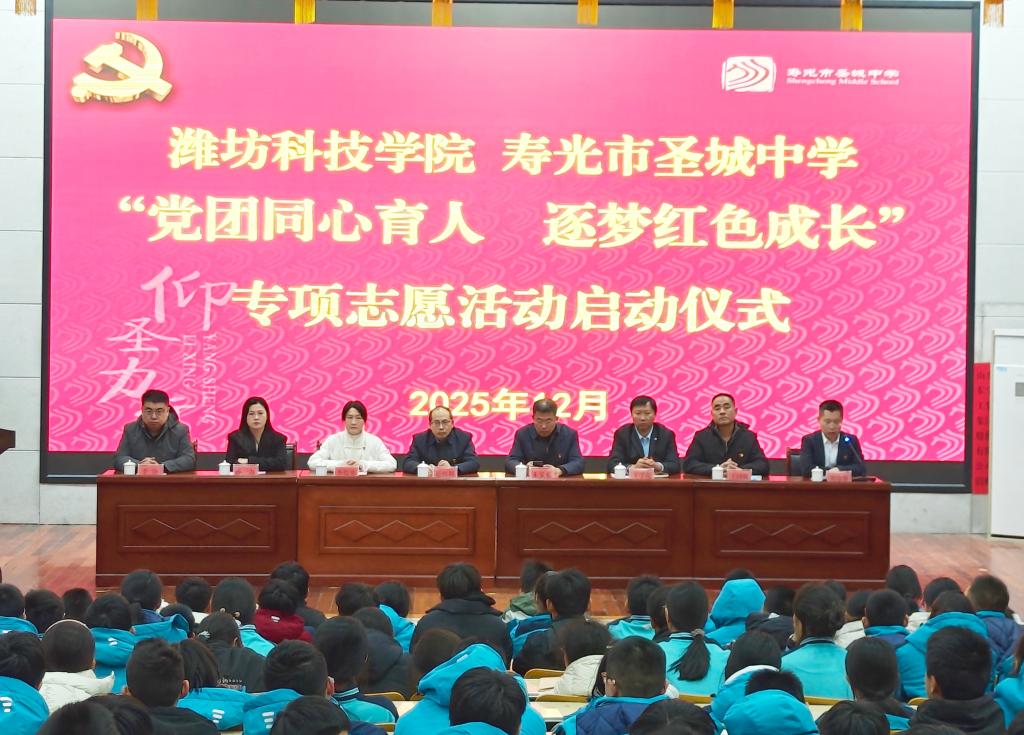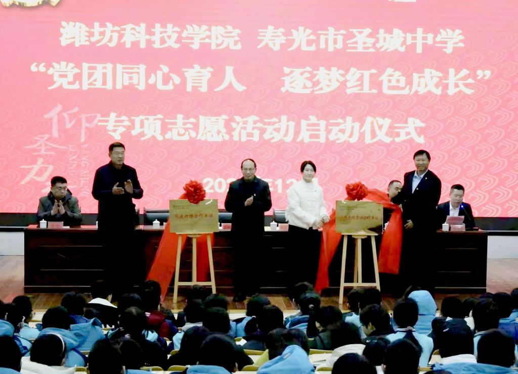 12月2日,马克思主义学院联合寿光市圣城中学举行“党团同心育人,逐梦红色成长”专项志愿活动启动仪式。潍坊科技学院党建办公室主任范绍利、学工部党总支书记李俊英、校团委书记孙一力、马克思主义学院相关领导与圣城中学校领导及师生代表共同参加活动。