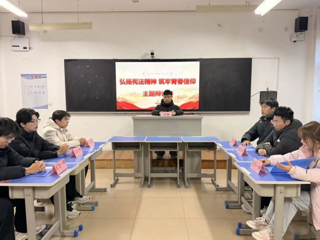 在校园内设置“弘扬宪法精神,筑牢青春信仰”主题横幅,学子们依次签名,以庄重的仪式感表达尊法、学法、守法、用法的坚定决心。相关负责人围绕“宪法与青年担当”展开分享,从宪法核心原则到现实应用,通过政策解读、典型案例分析、现场答疑等环节层层递进,用通俗语言传递法治理念,引导同学们树立尊崇宪法、践行宪法的自觉意识。各团支部召开主题班会,围绕“宪法与青年责任”“校园法治热点探讨”等话题,组织学子分享学习心得、交流身边法治案例,在讨论中凝聚法治共识。