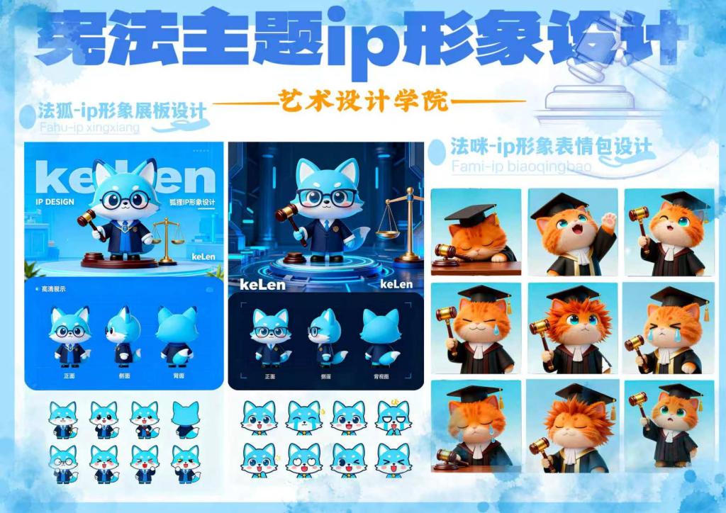 艺术设计学院举办“宪法主题ip形象设计”主题活动,设计通过可爱的狐狸形象结合法槌、天平、学士帽等元素,让严肃的宪法知识变得生动有趣,让宪法文化融入日常交流,推动法治理念更自然地走进同学们心里,让同学们在轻松氛围里感知宪法的温度与意义。