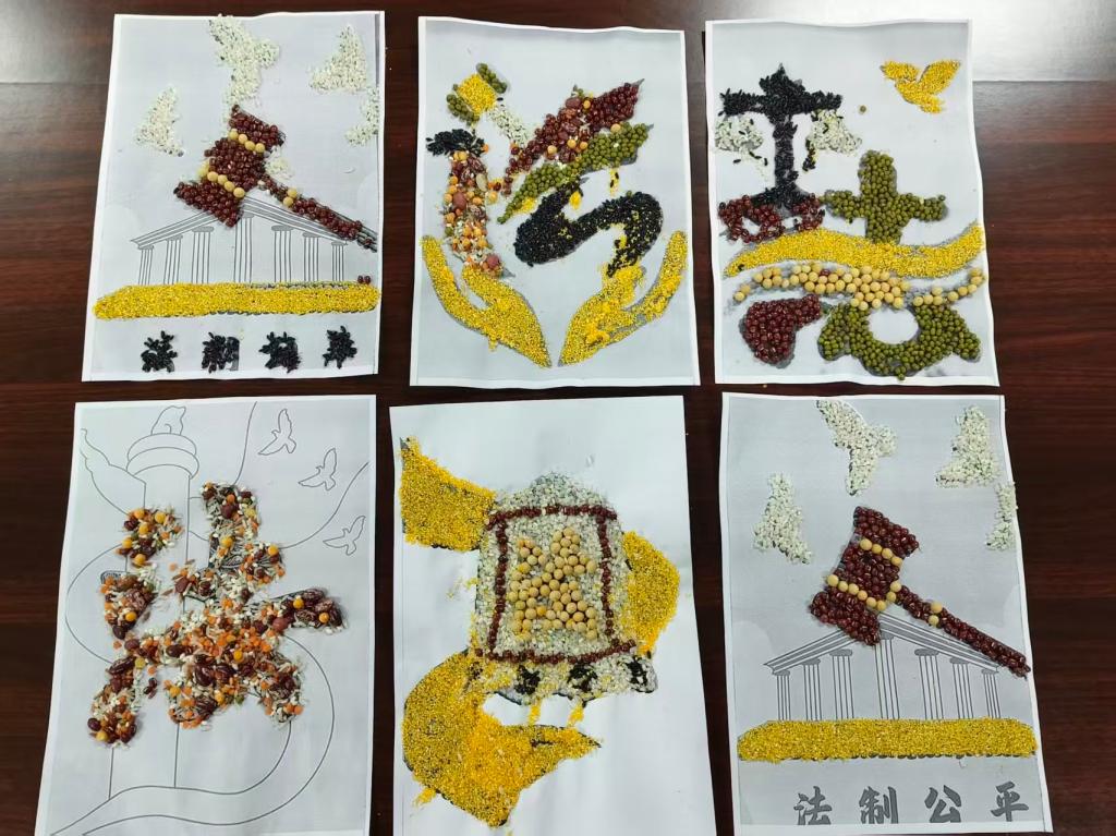 艺术设计学院举办“法治主题粮食粘贴画创作”活动,同学们围绕“法治,公平,公正”的主题,用豆子拼贴法治元素作品,以手工创作的方式传递法治知识,让法治精神以艺术化方式浸润同学们。