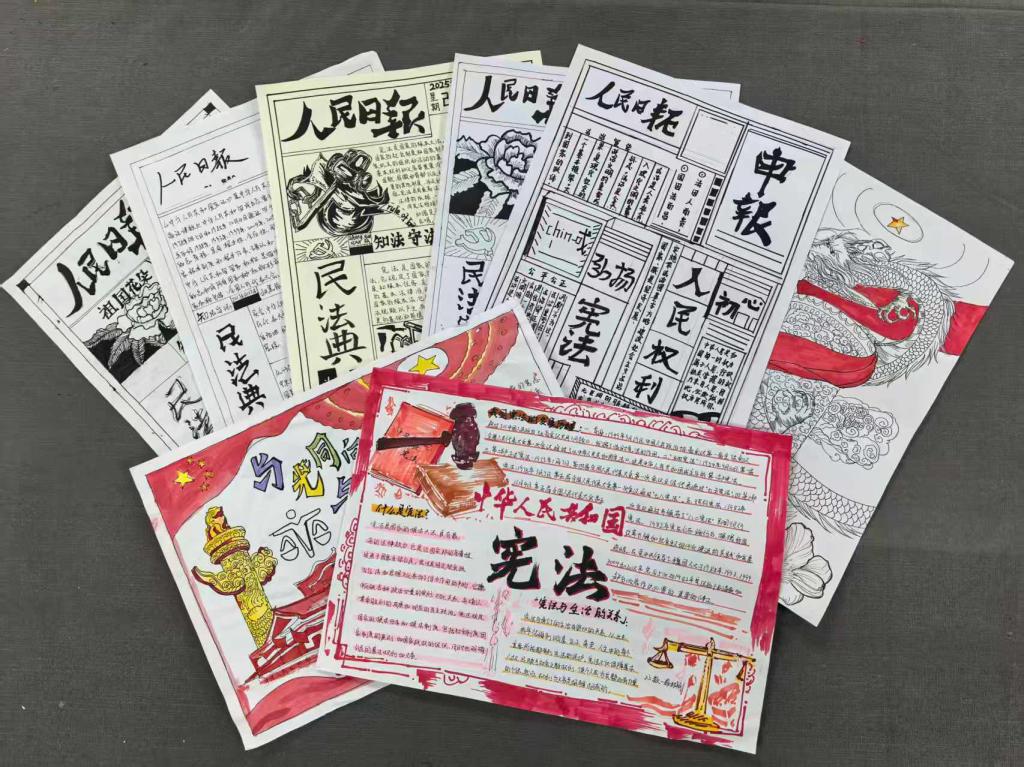 在“纸承宪意,艺述法治”主题手抄报活动中,同学们充分发挥专业特长,通过手绘创作将宪法知识以图文并茂的形式生动呈现,把抽象的法律条文转化为直观的视觉语言,实现了艺术表达与法治教育的有机融合。