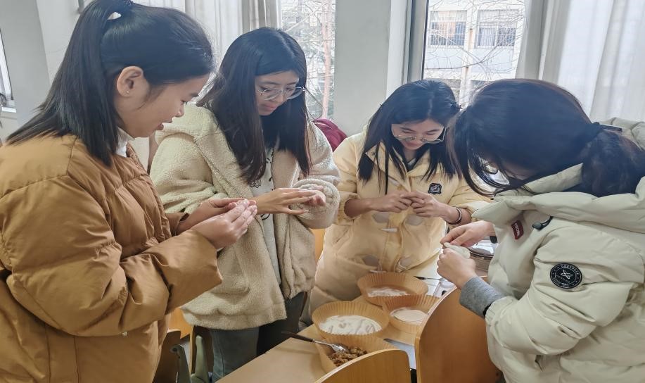 活动伊始,活动负责人以“溯源—释俗—践行”为主线开展冬至文化宣讲,系统梳理冬至节气的历史渊源与文化脉络。宣讲既援引《礼记》相关古制、“冬至大如年”等传统民谚,又结合南北饺子、汤圆等差异化食俗案例,清晰阐释了冬至所承载的团圆理念与文化内涵,进一步深化了同学们对传统节气的认知与理解。宣讲结束后,同学们分组有序就座,分工协作开展实践:擀皮、填馅、捏合等环节衔接有序,娴熟者主动分享操作技巧,协助新手快速掌握要领,各式形态的饺子整齐摆放。