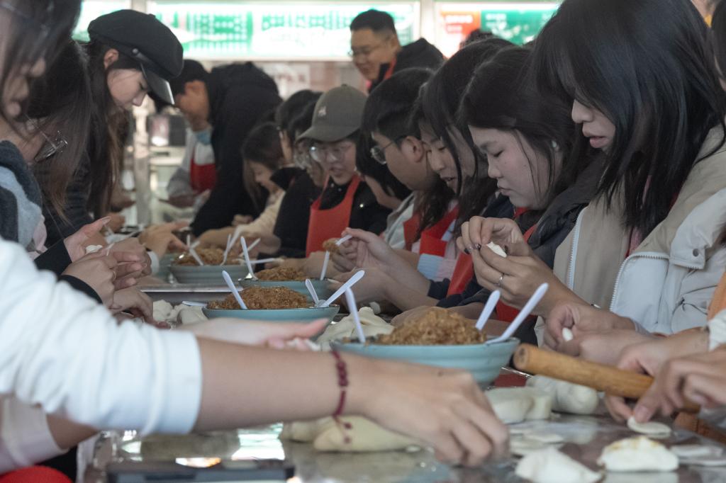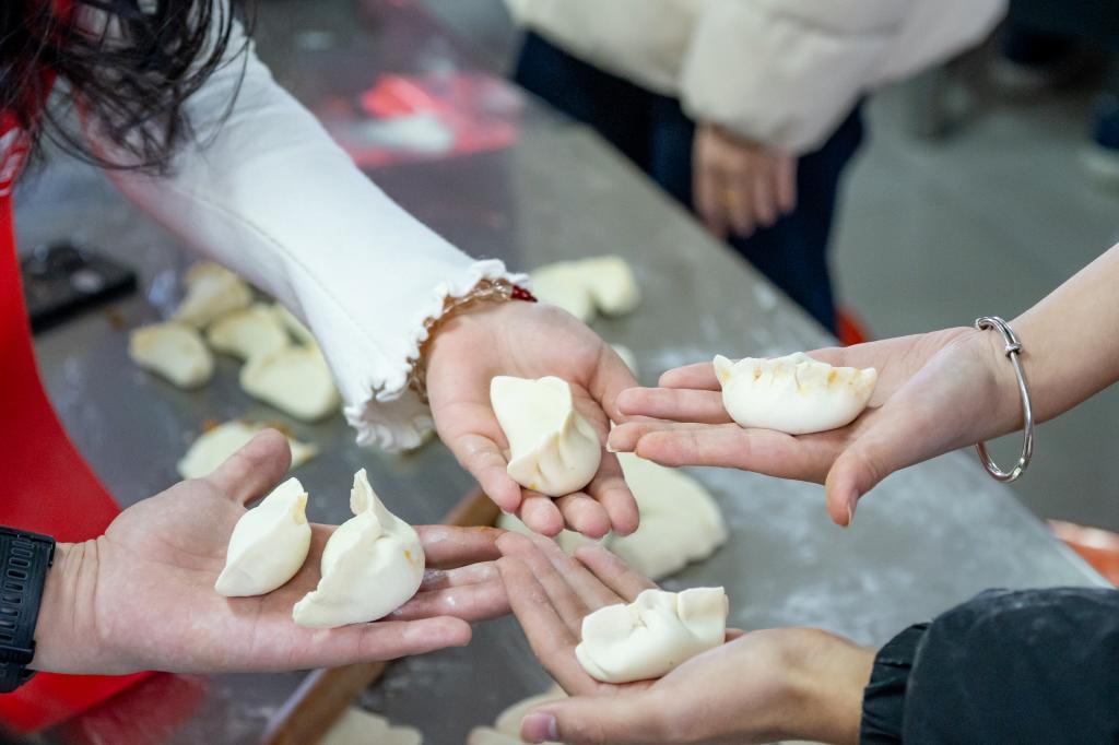 随后的民俗文化科普环节中,主持人结合冬至节气的由来与民间习俗,生动讲解饺子文化的起源与发展脉络,从医圣张仲景自制“娇耳汤”为百姓驱寒到“冬至不端饺子碗,冻掉耳朵没人管”的民间传说,从北方吃饺子、南方食汤圆的民俗差异到驱寒暖身、祈福安康的寓意解读,师生们边听边做,在指尖的实践中触摸文化脉络,感知民俗生命力。饺子出锅时分,香气四溢。师生围坐共同品尝亲手包制的饺子,畅谈校园生活的点滴趣事,分享活动中的收获与喜悦。热气腾腾的饺子驱散冬日的寒意,真挚融洽的交流拉近师生的距离。