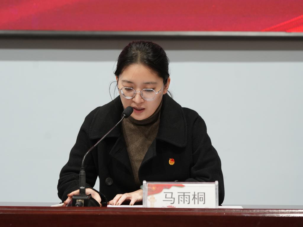 仪式在雄壮的国歌声中拉开帷幕,全场人员肃立致敬,爱国情怀与青春热忱在空气中激荡。团委老师马雨桐宣读《潍坊科技学院2025年度新发展团员名单》,校团委副书记宋林芹为新发展团员代表颁发团员证,并亲手为他们佩戴团徽。熠熠生辉的团徽佩戴在胸前,不仅是一份荣誉的象征,更承载着沉甸甸的责任与使命。在杜正超同学的带领下,全体新团员高举右拳,面向团旗庄严宣誓,铿锵有力的誓言回荡在报告厅内,彰显着新时代青年听党话、跟党走的坚定决心与奋进姿态。团章领学环节中,张雅萍同学带领新团员们深入学习《中国共产主义青年团章程》,进一步明晰团员的权利与义务,筑牢信仰之基、补足精神之钙。