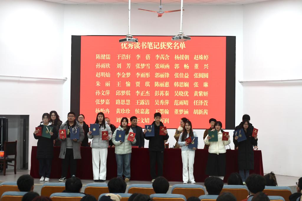 会上,文学院教研室主任李思琪宣读文学院考风考纪规定,党支部副书记唐玉海强调诚信应考并给出备考建议,党支部书记王燕玲重申考风考纪重要性并寄语同学。表彰环节,党支部书记王燕玲与团总支书记高芬分别公布优秀读书笔记、读书标兵及“书香润心·墨韵传情”活动获奖名单。随后,2025级各班导师总结班级读书工作并指出共性问题,王译晗、于文昊两位老师复盘读书活动并提出改进建议。最后,文学院院长孙淑娟作总结讲话,强调考风考纪严肃性,倡导师生多读书、读好书,推动传统与新兴阅读融合。
