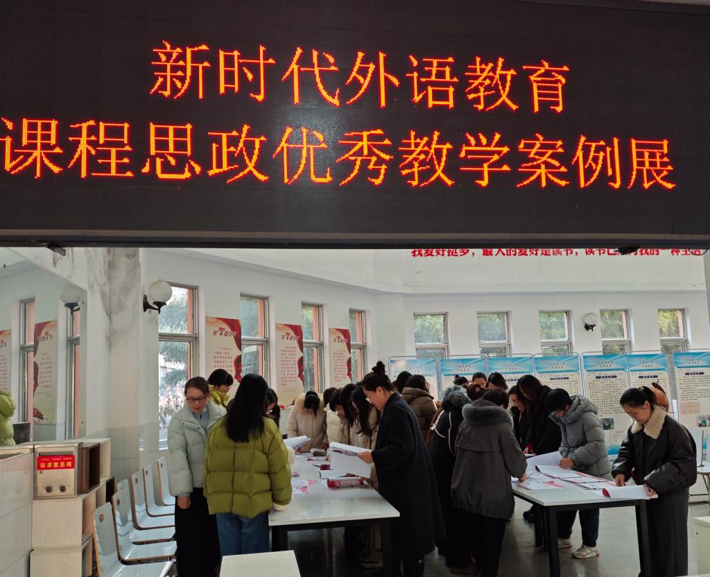 为深入推进新时代外语教育课程思政建设,总结推广优秀教学经验,提升全体教师课程思政教学能力,12月31日,外国语学院在一楼大厅组织开展“新时代外语教育课程思政优秀教学案例展”。学院全体教师前往现场观摩学习,共同探讨外语教学与思政教育深度融合的有效路径。