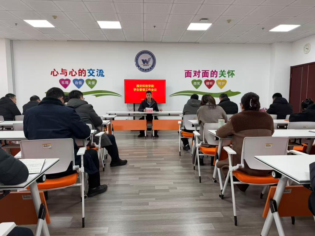 为确保2026年春季学期学生返校工作平稳有序,筑牢校园安全防线。3月6日,学工处在图书馆一楼团训室召开学生管理工作会议。学校党委委员、学工处处长孙宝国主持会议并讲话,各二级学院书记参加会议。