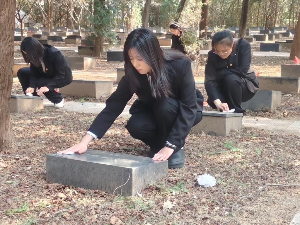 仪式环节,全体人员面向烈士公墓肃立默哀,深切追思先烈功绩,敬献鲜花与自制花束,表达对革命先烈的无限追思与崇高敬意。默哀结束后,师生们前往烈士墓区,用心擦拭墓碑,以实际行动致敬英雄忠魂,在躬身实践中传承红色精神。