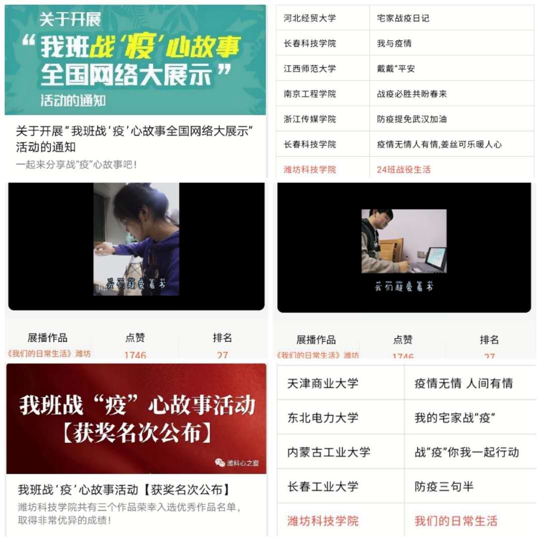 学工处心理健康教育中心相应号召积极组织,各院系心理辅导老师精心指导,同学们踊跃参加,以视频的形式记录了疫情期间发生在班级中的真实故事、场景,同学们的亲身经历和珍惜、尊重、热爱生命的启发等,传播抗疫正能量。经过中国心理学会心理危机干预工作委员会专家、全国高校心理委员研究协作组理事们的精心评审,从全国各高校3201个战‘疫’心故事视频作品中挑选出300个优秀作品。其中,我校《24班战役生活》、《我们的日常生活》及《原来居家生活可以这样有趣》3个作品脱颖而出,顺利入选。