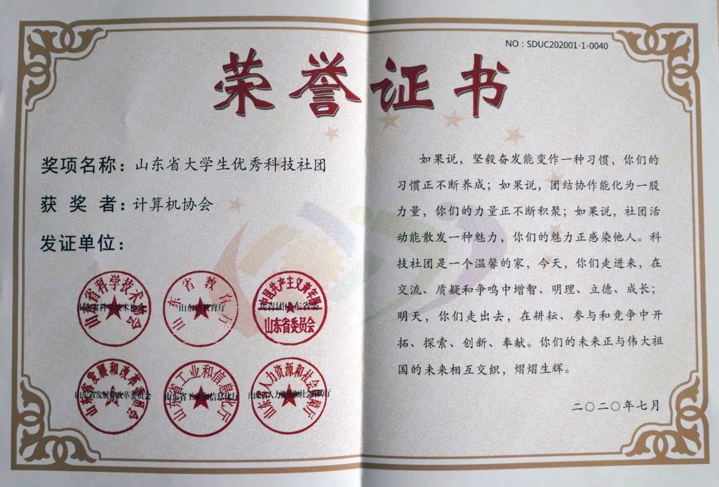 在山东省科协与山东省教育厅、共青团山东省委等多部门联合开展的2020年山东省大学生优秀科技社团和优秀科技社团干部评选活动中,计算机软件学院计算机协会社团被评为“2020年山东省大学生优秀科技社团”,李新宇同学被评为“2020年山东省大学生优秀科技社团干部”。