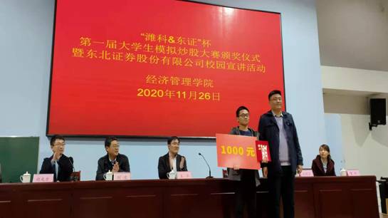 大赛本着校企联合促学,响应监管部门投教活动进校园的宗旨,通过提供线上虚拟证券交易平台,鼓励金融类专业学生积极参与,进一步加深对证券行业的了解。经过比赛,共产生一等奖一名、二等奖二名、三等奖三名。其中一等奖奖金1000元、二等奖500元、三等奖200元。东北证券股份有限公司潍坊营业部财富总监高晓宾分别为一、二、三等奖获奖学生颁发奖学金和荣誉证书。