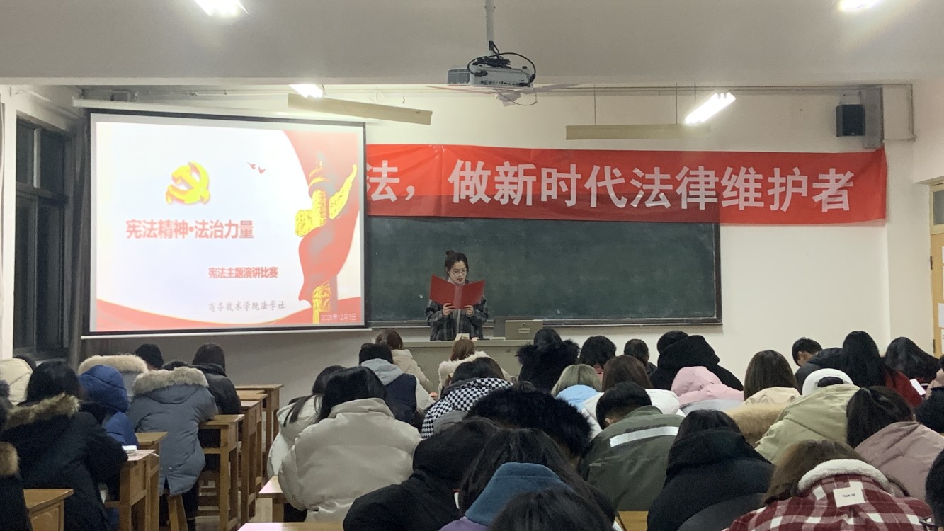 为深入学习贯彻党的十九大和十九届二中、三中、四中、五中全会精神,深入学习宣传习近平法治思想,弘扬宪法精神,维护宪法权威,推动宪法全面实施,商务技术学院创新方式方法,增强宣传实效,组织开展了“宪法宣传周”系列活动,使宪法精神深入人心,以宪法精神凝心聚力。