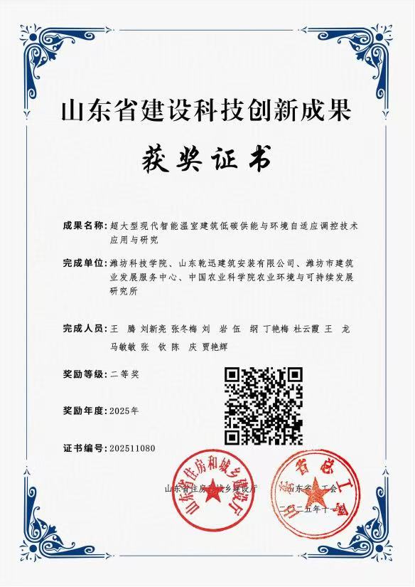 近日,山东省住房和城乡建设厅与山东省总工会联合公布了2025年全省建设科技创新成果竞赛获奖名单,由土木工程学院院长王腾牵头,联合山东乾迅建筑安装有限公司、潍坊市建筑业发展服务中心及中国农业科学院农业环境与可持续发展研究所共同完成的“超大型现代智能温室建筑低碳供能与环境自适应调控技术应用与研究”项目,在众多优秀成果中脱颖而出,荣获竞赛二等奖。