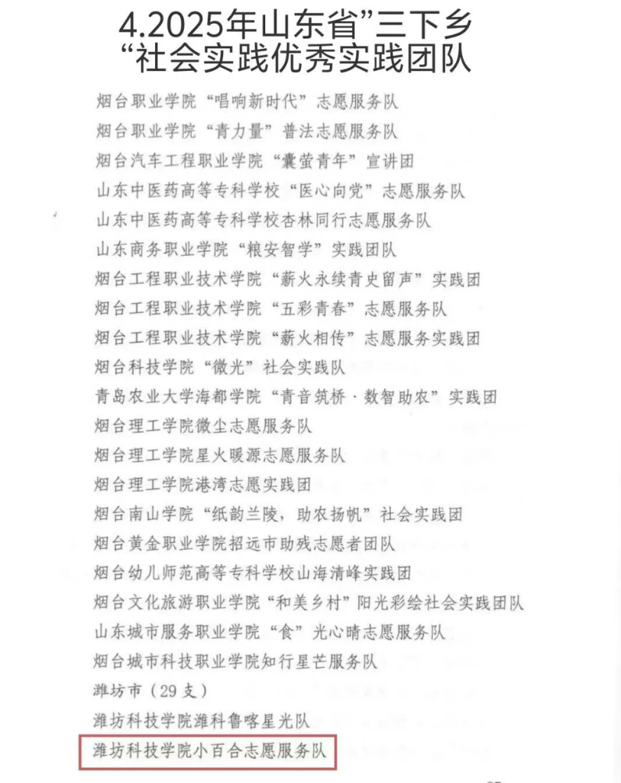 近日,2025年山东省大中专学生暑期文化科技卫生“三下乡”社会实践活动省级获奖名单公布,马克思主义学院“小百合”志愿服务队及相关师生斩获“社会实践优秀指导教师”、“社会实践优秀学生”、“社会实践优秀团队”等荣誉。 荣誉的取得彰显了青年学生担当作为的精神风貌,是学院深化实践育人成果的生动体现。未来,马克思主义学院将坚持立德树人根本任务,助力学生在社会实践中锤炼本领、增长才干,为服务社会发展贡献力量。