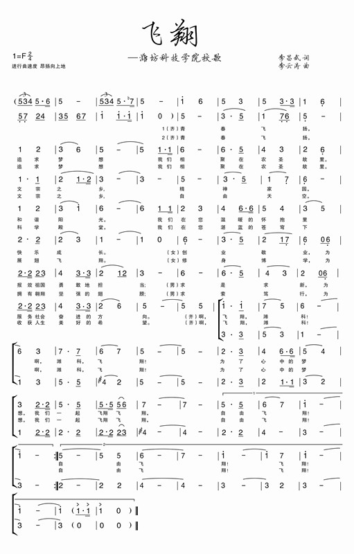 副歌部分“啊,飞翔,潍科!啊,潍科,飞翔!为了心中的梦想,我们一起飞翔,自由飞翔!”既是抒情又是高呼,既是对学院未来的展望,也是对全院师生的呼吁。“啊,飞翔,潍科!”尽抒对学院的热爱和赞美之情。“啊,潍科,飞翔”则是对学院未来的展望和热爱之情的进一步升华。